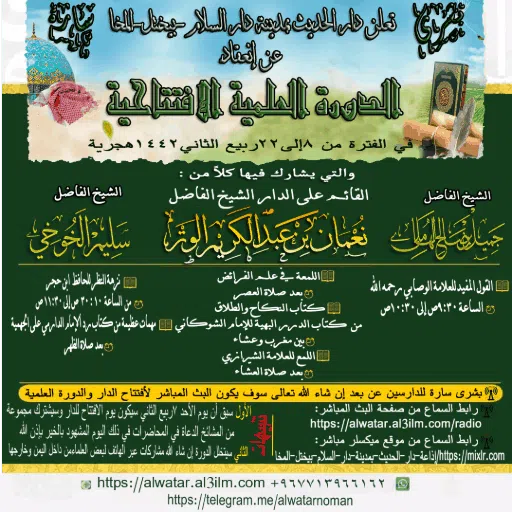 الدورة العلمية الافتتاحية كتاب النكاح من كتاب الدرر البهيه للإمام الشوكاني الأحد ۲۸ ربيع الثاني ۱٤٤۲ هـ الموافق ۱۳ ديسمبر ۲۰۲۰ مـ | الدورات العلمية | شارك بتعليقك الدورة العلمية الافتتاحية كتاب النكاح من كتاب الدرر البهيه للإمام الشوكاني شرح فضيلة الشيخ نعمان بن عبد الكريم الوتر حفظه الله تعالى القيت في دار الحديث السلفية -بدار السلام- بيختل -المخا حرسها الله بين مغرب وعشاء PlayStopNext»«Prev HIDE PLAYLIST نافذة X مقالات ذات صلة الدورة العلمية الافتتاحية كتاب اللمعه في علم الفرائض الدورة العلمية الافتتاحية كتاب اللمع للشيرازي الدورة العلمية الافتتاحية كتاب النكاح من كتاب الدرر البهيه للإمام الشوكاني اترك ردإلغاء الرد